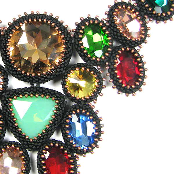 Black Beauty Cabochon Bezel Necklace PDF digital download pattern by Ann Benson. Coordinates with the Black Beauty Bracelet pattern. This pattern features many different standard size crystal stones, and requires only four different seed beads. The stones are bezeled in peyote stitch in the round, and secured together in a specific arrangement. The pattern includes a detailed, precise diagram for assembling the stones after bezeling. Also included are clear directions for sizing the necklace up to 18". This stunning necklace is much easier to create than it looks, and works up surprisingly quickly. Links to free online videos for the techniques used are included in the download PDF.