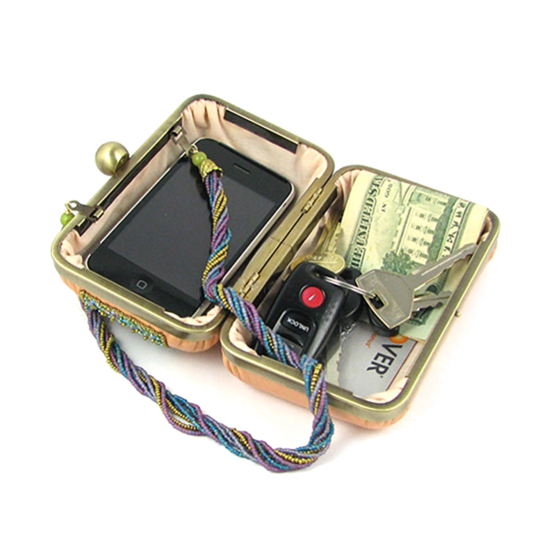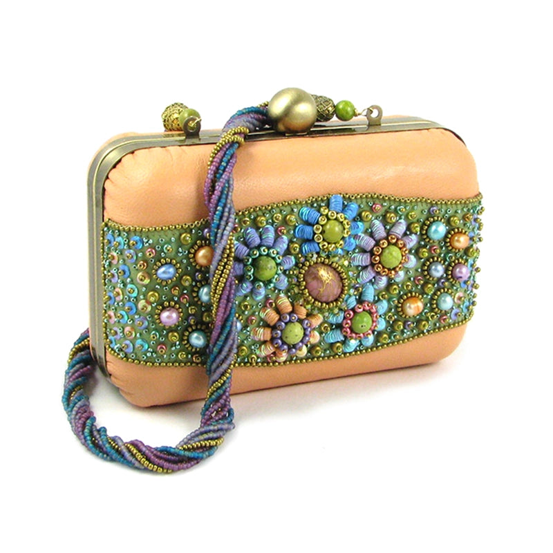 The beaded floral panel is stitched in bead embroidery and then mounted on genuine peach-colored leather for the front; the back is a simple undecorated panel of the same leather. The leather panels are mounted on a rigid form with brushed gold edges. Lined in a coordinating color of broadcloth. The removable handle is made of multiple strands of colorful seed beads. Size is 5.5" long by 3.5" tall by 2.25" wide. This is Ann's original model for a kit that was last sold in 2015.