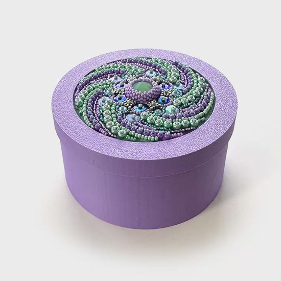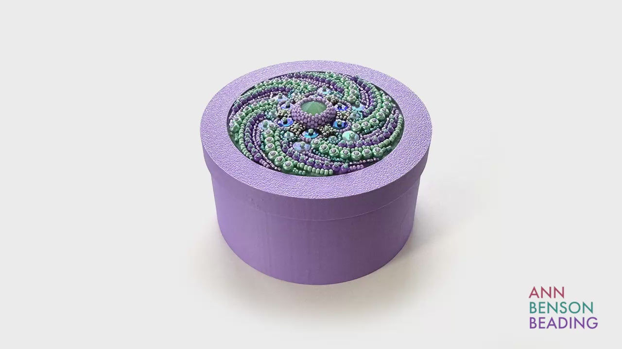 No finishing required for this 3D box with a friction fit lid insert that holds your project securely in place. The kit includes the box itself (choose from three colors), the design in color on non-woven stitching base, all the beads and stones, thread, needle, complete directions for stitching and inserting the finished project into the box. View our YouTube video for easy assembly or watch the video below.